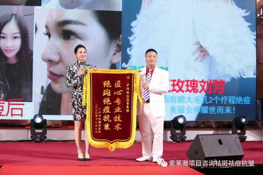 【笔者问:索莱雅加盟店广州红玫瑰老板刘芳,为什么要送锦旗?刘芳说,索莱雅让她赚钱了!】