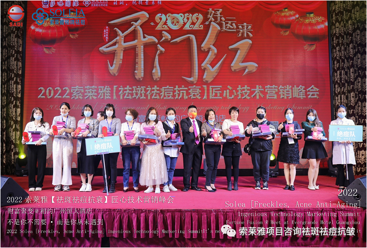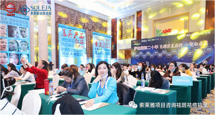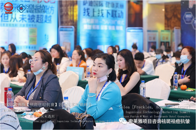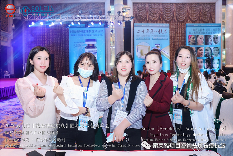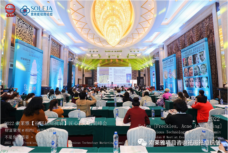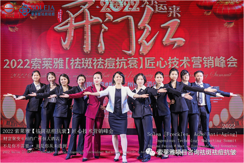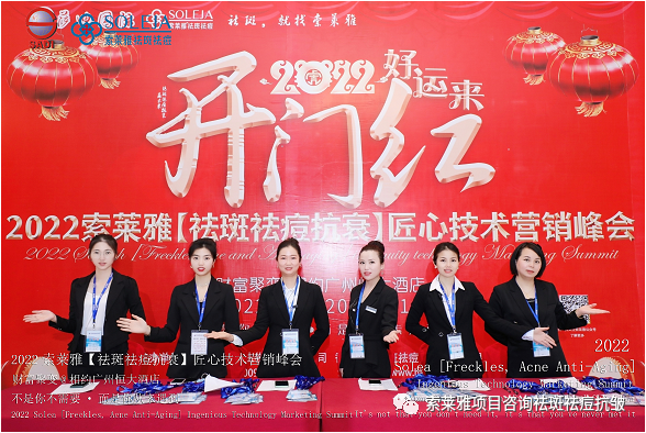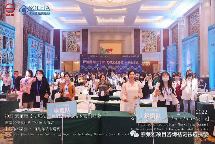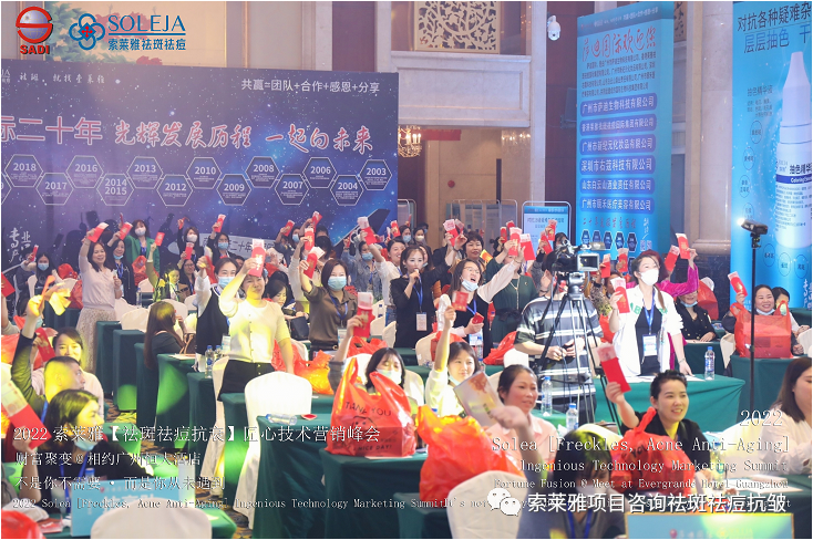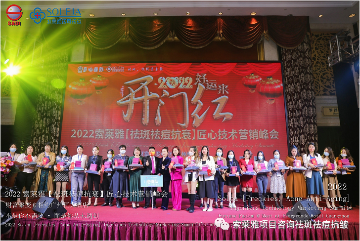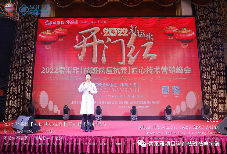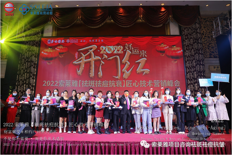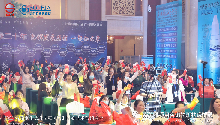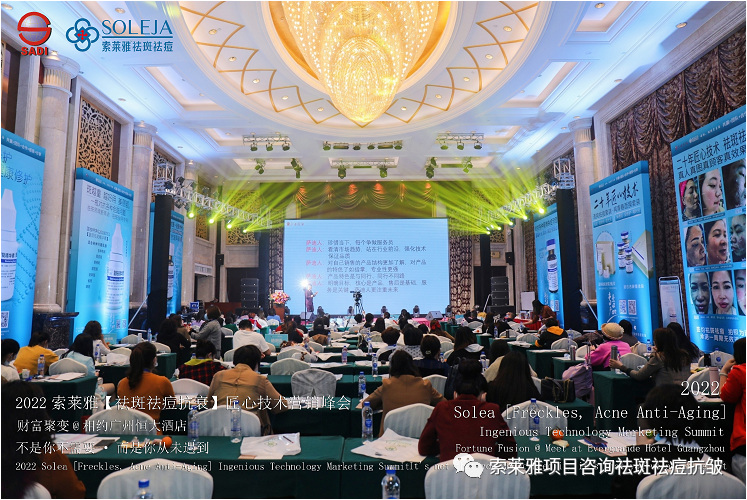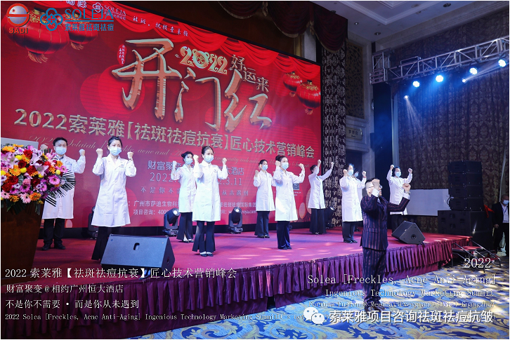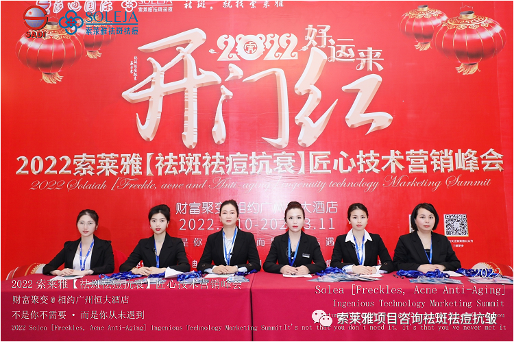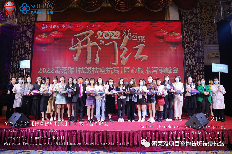 不管外部环境如何变化,索莱雅人不忘初心,始终如一,20年专业专注疑难杂症问题性皮肤:斑、疤痕、痘痘、激素性皮炎、抗皱等五大刚需项目。索莱雅冲出美容“红海”, 开劈了美容“新天地”,2022索莱雅开门红好运来【祛斑祛痘抗衰】匠心技术营销峰会于2022年3月10-11日在广州恒大五星酒店激情活力!圆满成功!
